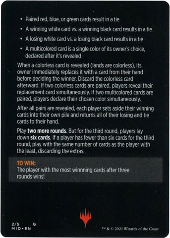 When a colorless card is revealed (lands are colorless), its owner immediately replaces it with a card from their hand before deciding the winner. Discard the colorless card afterward. If two colorless cards are paired, players reveal their replacement card simultaneously. If two multicolor cards are paired, players declare their chosen color simultaneously.