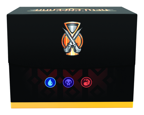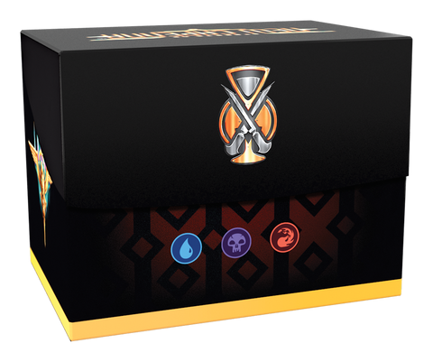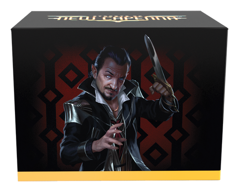 The Maestros Massacre Streets of New Capenna Commander Deck set includes 1 ready-to-play Blue-Black-Red deck of 100 Magic cards (2 traditional foil, 98 nonfoil), a 2-card Collector Booster Sample Pack, 1 foil-etched Display Commander (a thick cardstock copy of the commander card with foil etched into the card's border and art), 10 double-sided tokens, 1 counter punchout card, 1 deck box (can hold 100 sleeved cards), 1 life tracker, and 1 reference card.